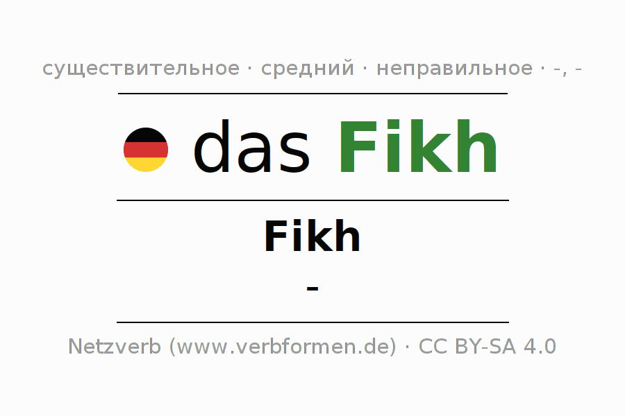Склонение существительного Fikh (фикх) даётся в родительном падеже единственного числаFikh и в именительном падеже множественного числа -. Существительное Fikh при склонении получает окончания -/-. Не образует форм множественного числа. Грамматический род Fikh средний с определённым артиклем "das" Здесь можно просклонять не только Fikh, но и все немецкие существительные. Kомментарии ☆