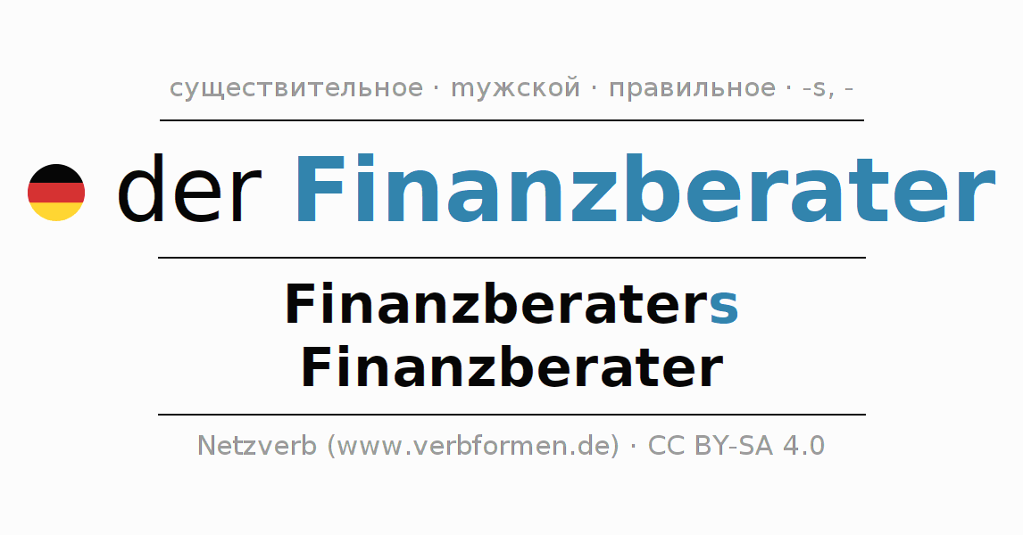 - Множественное число: die Finanzberater, der Finanzberater, den Finanzberatern, die Finanzberater