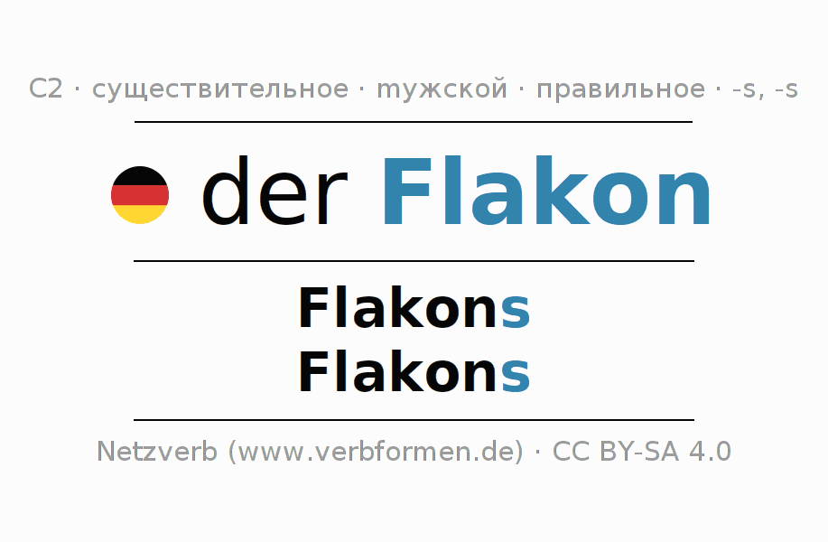 - Единственное число: der Flakon, des Flakons, dem Flakon, den Flakon