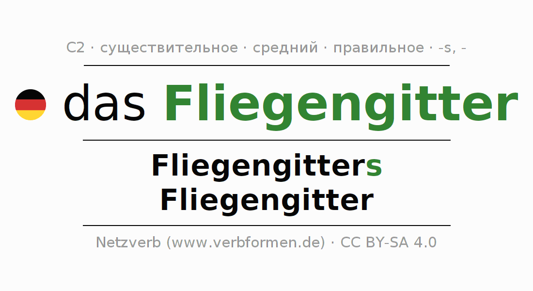 - Единственное число: das Fliegengitter, des Fliegengitters, dem Fliegengitter, das Fliegengitter