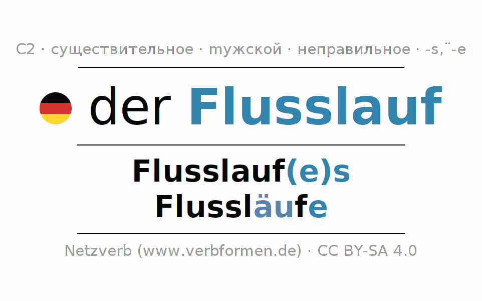 - Множественное число: die Flussläufe, der Flussläufe, den Flussläufen, die Flussläufe