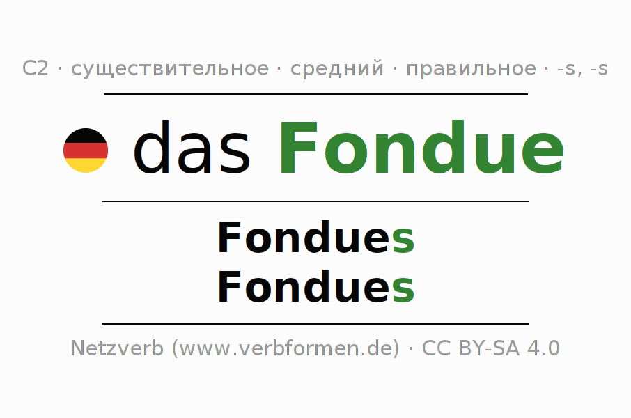 Склонение существительного Fondue (фондю, фондю́) даётся в родительном падеже единственного числаFondues и в именительном падеже множественного числа Fondues. Существительное Fondue склоняется по сильному типу, получая окончания s/s. Может употребляться и с другими окончаниями. Грамматический род Fondue средний с определённым артиклем "das" Однако существительное может употребляться в другом роде и с другим артиклем. Здесь можно просклонять не только Fondue, но и все немецкие существительные. Существительное включён в словарный запас обладателя сертификата знания немецкого языка уровня C2. Kомментарии ☆