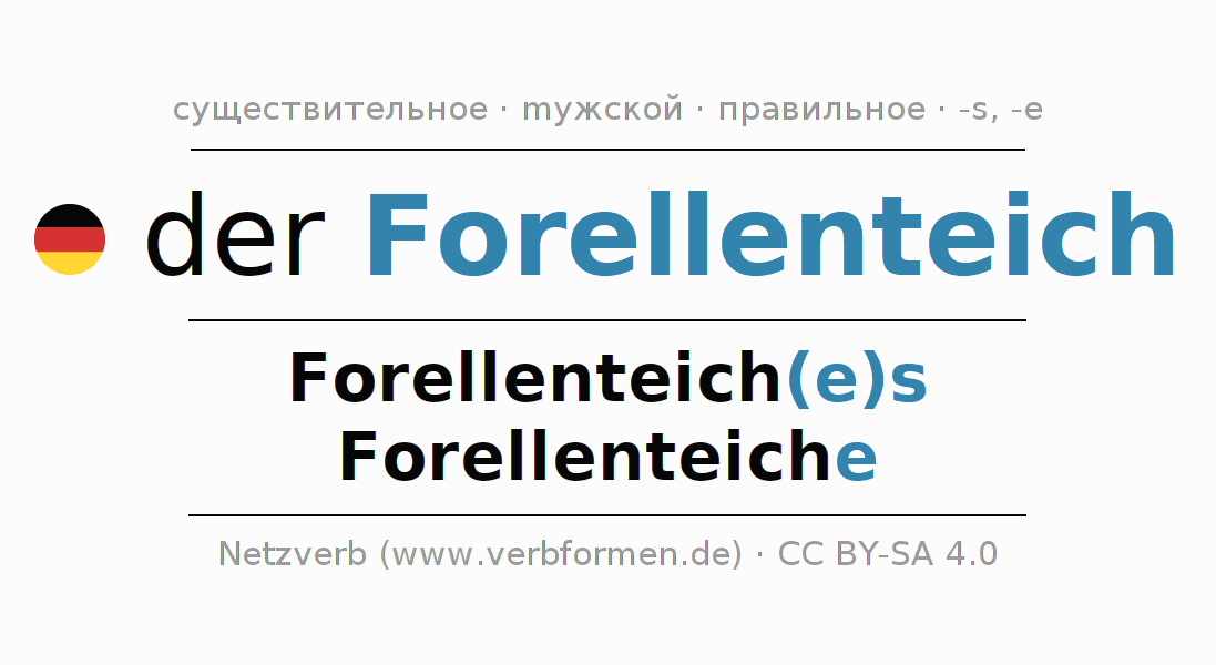 - Единственное число: der Forellenteich, des Forellenteich(e)s, dem Forellenteich(e), den Forellenteich