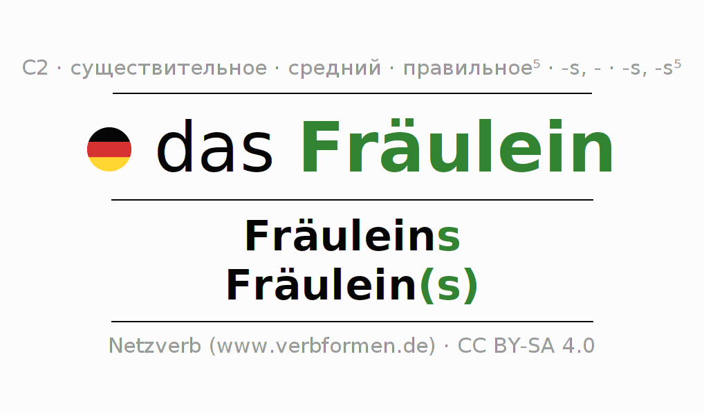 Склонение существительного Fräulein (девушка, ба́рышня) даётся в родительном падеже единственного числаFräuleins и в именительном падеже множественного числа Fräulein(s). Существительное Fräulein склоняется по сильному типу, получая окончания s/-/s. Может употребляться и с другими окончаниями. Грамматический род Fräulein средний с определённым артиклем "das" Однако существительное может употребляться в другом роде и с другим артиклем. Здесь можно просклонять не только Fräulein, но и все немецкие существительные. Существительное включён в словарный запас обладателя сертификата знания немецкого языка уровня C2. Kомментарии ☆