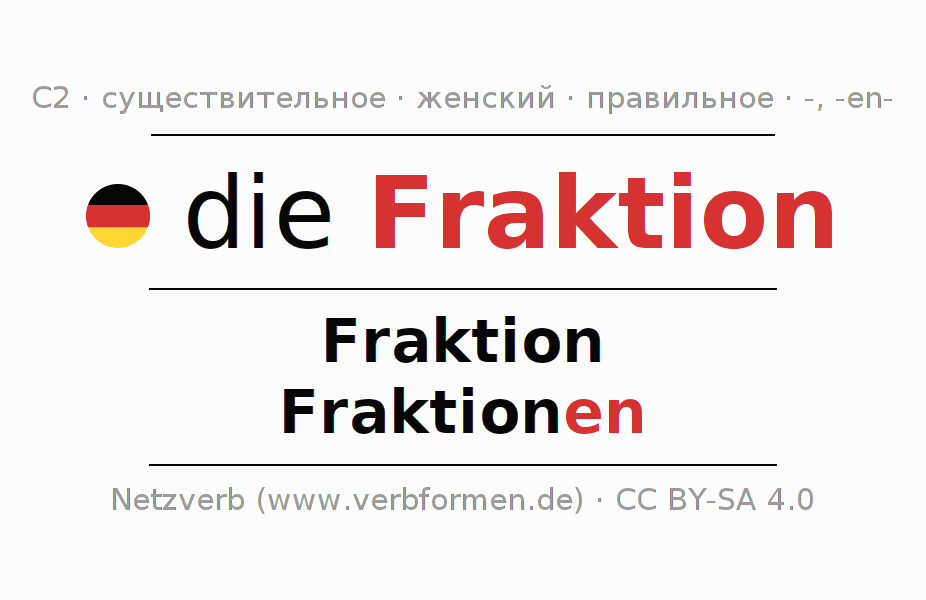 - Множественное число: die Fraktionen, der Fraktionen, den Fraktionen, die Fraktionen