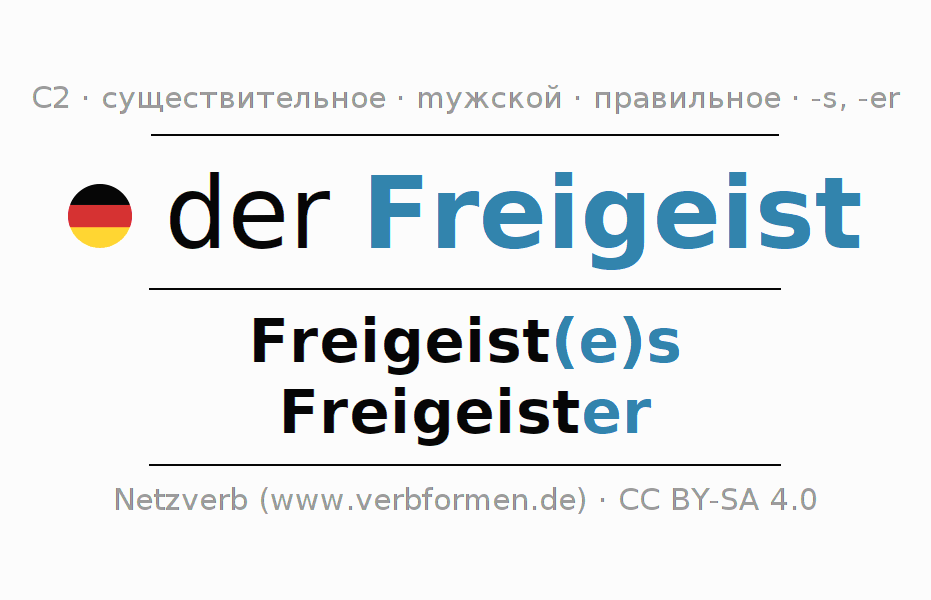 Склонение существительного Freigeist (вольноду́мец, свободомы́слящая) даётся в родительном падеже единственного числаFreigeist(e)s и в именительном падеже множественного числа Freigeister. Существительное Freigeist склоняется по сильному типу, получая окончания es/er. Грамматический род Freigeist мужской с определённым артиклем "der" Здесь можно просклонять не только Freigeist, но и все немецкие существительные. Существительное включён в словарный запас обладателя сертификата знания немецкого языка уровня C2. Kомментарии ☆