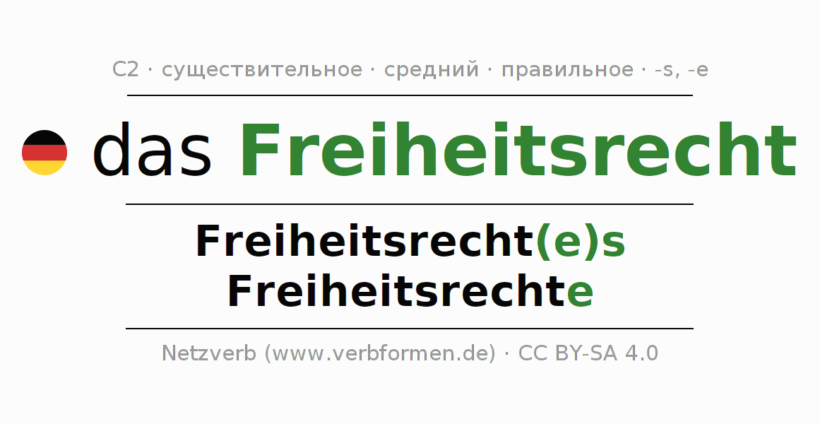 Склонение существительного Freiheitsrecht (право на свободу) даётся в родительном падеже единственного числаFreiheitsrecht(e)s и в именительном падеже множественного числа Freiheitsrechte. Существительное Freiheitsrecht склоняется по сильному типу, получая окончания es/e. Грамматический род Freiheitsrecht средний с определённым артиклем "das" Здесь можно просклонять не только Freiheitsrecht, но и все немецкие существительные. Существительное включён в словарный запас обладателя сертификата знания немецкого языка уровня C2. Kомментарии ☆