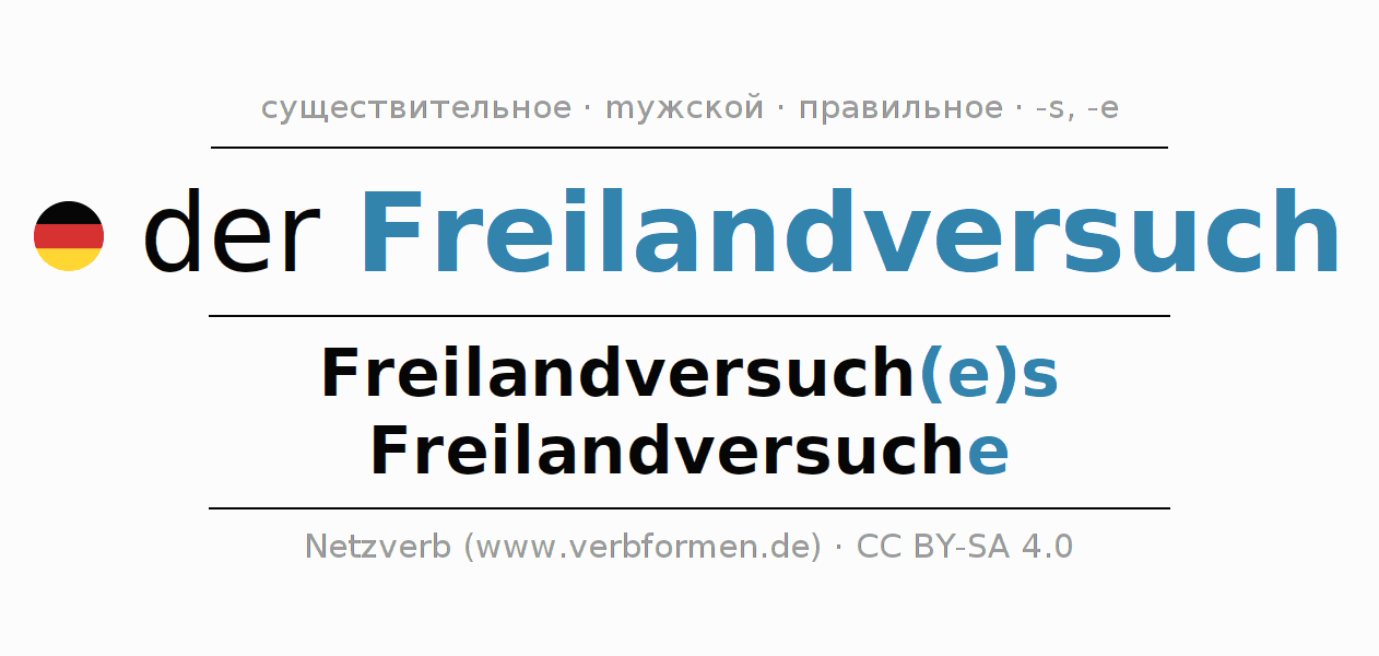 - Множественное число: die Freilandversuche, der Freilandversuche, den Freilandversuchen, die Freilandversuche