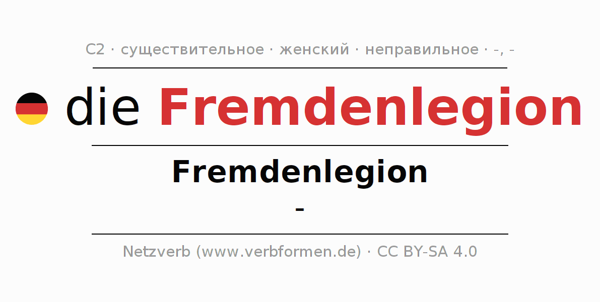Склонение существительного Fremdenlegion (иностра́нный легио́н, иностранный легион) даётся в родительном падеже единственного числаFremdenlegion и в именительном падеже множественного числа -. Существительное Fremdenlegion при склонении получает окончания -/-. Не образует форм множественного числа. Грамматический род Fremdenlegion женский с определённым артиклем "die" Здесь можно просклонять не только Fremdenlegion, но и все немецкие существительные. Существительное включён в словарный запас обладателя сертификата знания немецкого языка уровня C2. Kомментарии ☆