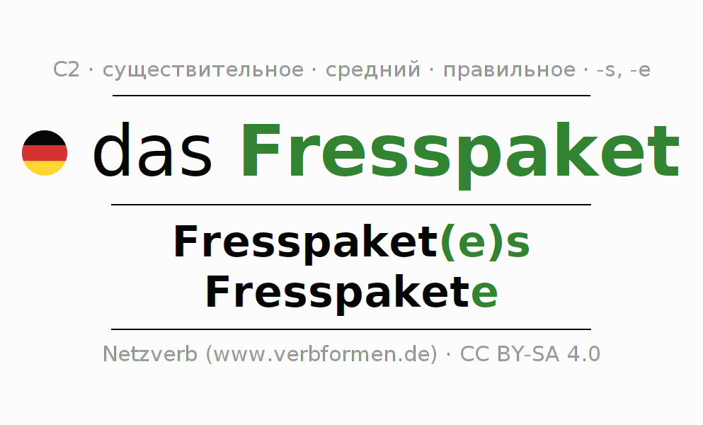- Множественное число: die Fresspakete, der Fresspakete, den Fresspaketen, die Fresspakete