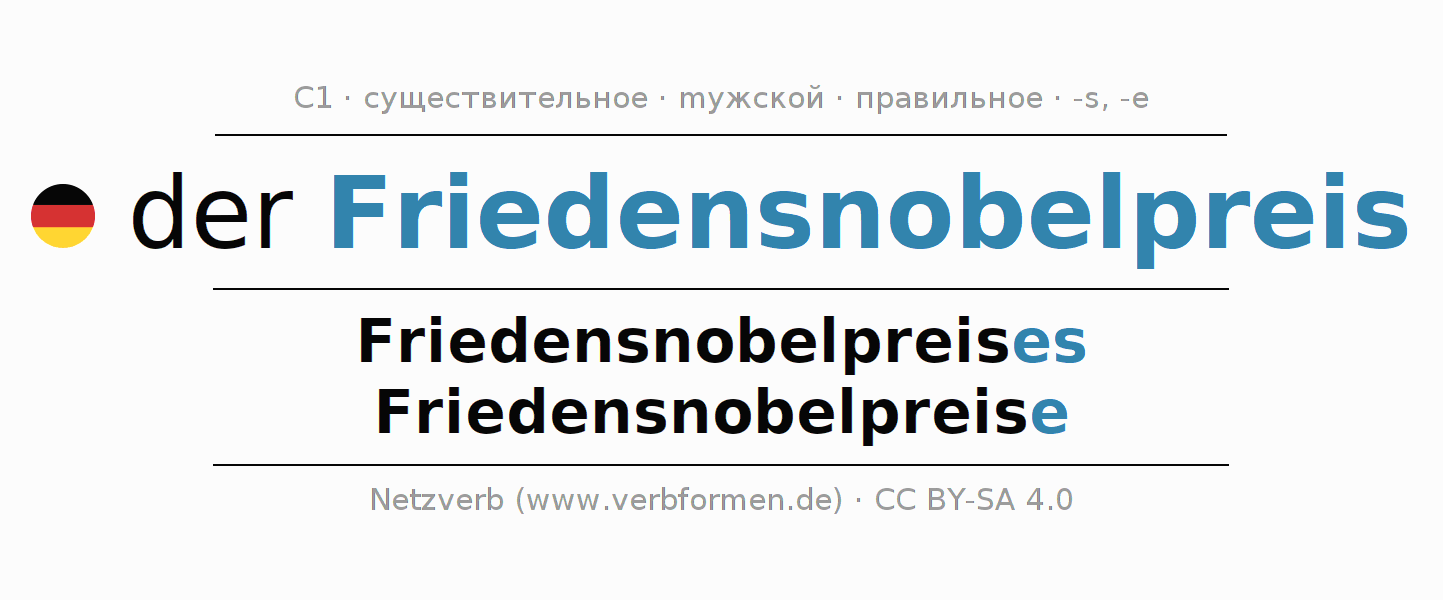 - Единственное число: der Friedensnobelpreis, des Friedensnobelpreises, dem Friedensnobelpreis(e), den Friedensnobelpreis