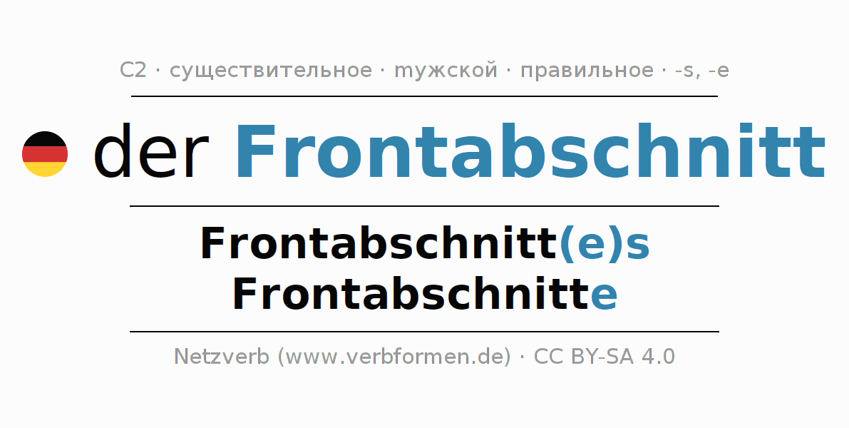- Множественное число: die Frontabschnitte, der Frontabschnitte, den Frontabschnitten, die Frontabschnitte