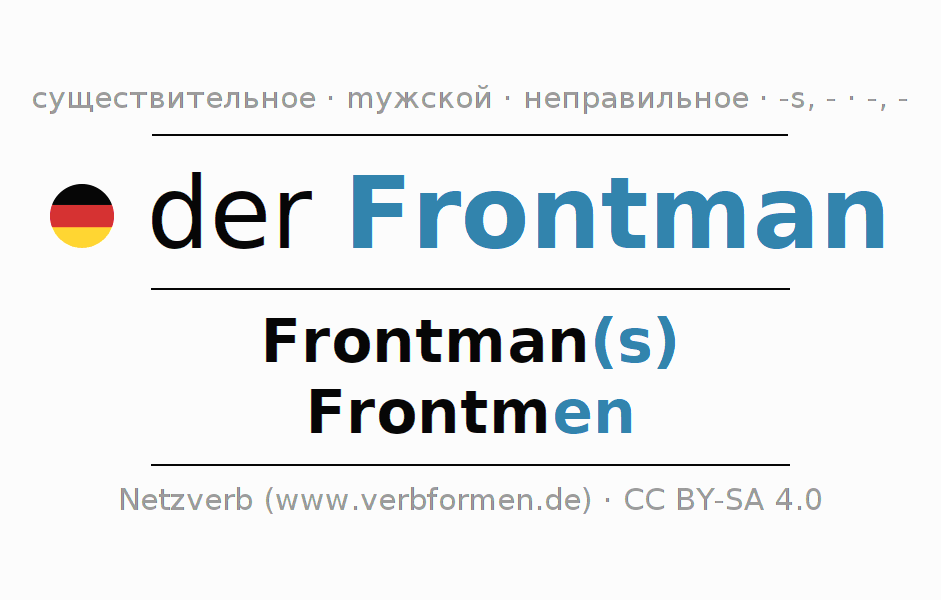 Склонение существительного Frontman (ведущий вокалист, фронтмен) даётся в родительном падеже единственного числаFrontman(s) и в именительном падеже множественного числа Frontmen. Существительное Frontman при склонении получает окончания s/-/en. Грамматический род Frontman мужской с определённым артиклем "der" Здесь можно просклонять не только Frontman, но и все немецкие существительные. Kомментарии ☆