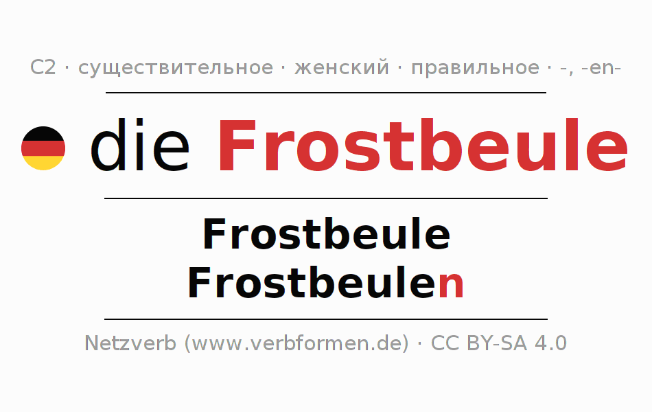 - Множественное число: die Frostbeulen, der Frostbeulen, den Frostbeulen, die Frostbeulen