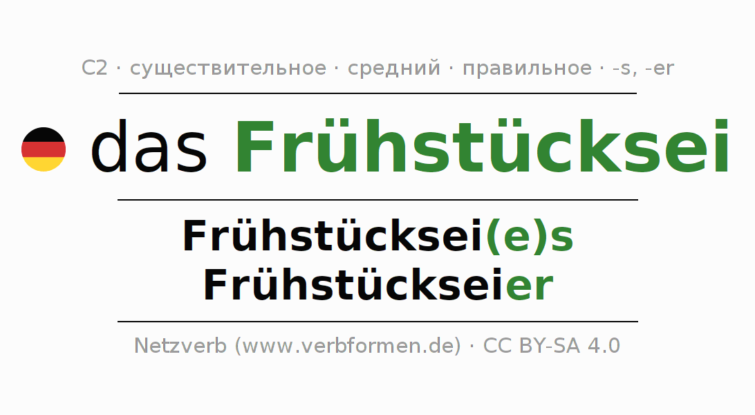- Множественное число: die Frühstückseier, der Frühstückseier, den Frühstückseiern, die Frühstückseier