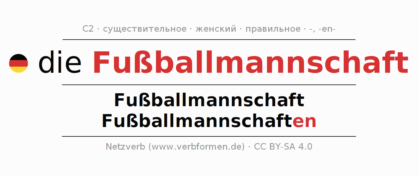 - Единственное число: die Fußballmannschaft, der Fußballmannschaft, der Fußballmannschaft, die Fußballmannschaft