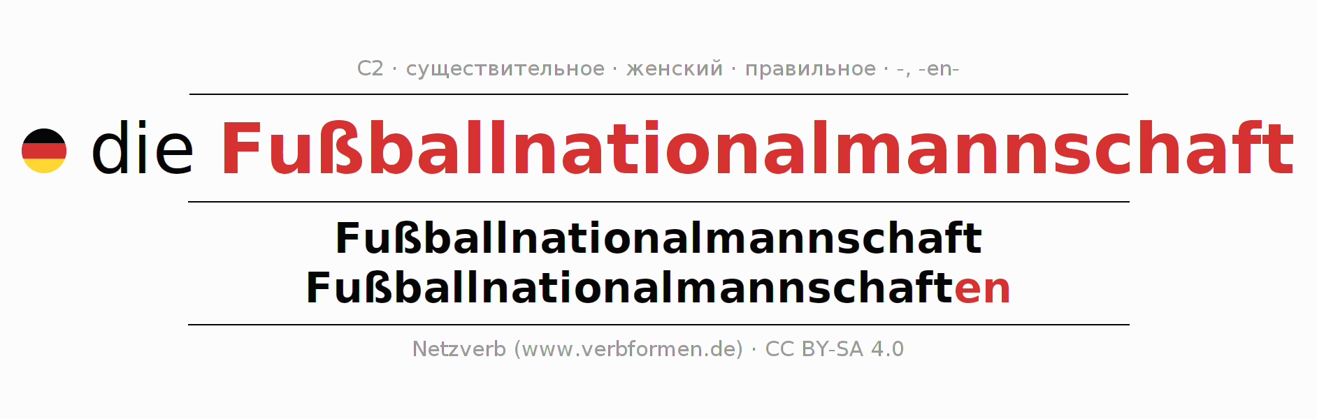 - Единственное число: die Fußballnationalmannschaft, der Fußballnationalmannschaft, der Fußballnationalmannschaft, die Fußballnationalmannschaft