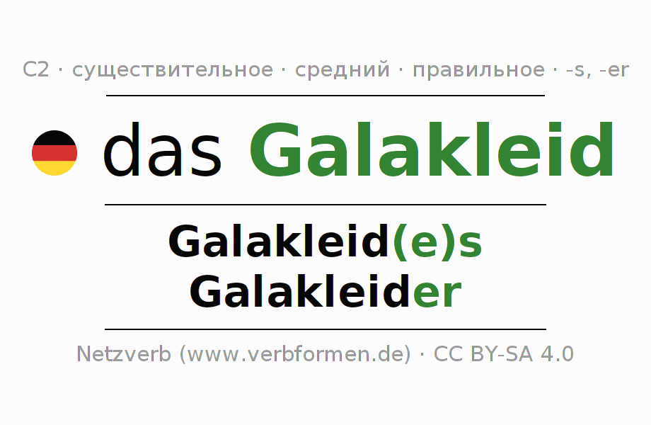 Склонение существительного Galakleid (официальное платье, праздничная одежда) даётся в родительном падеже единственного числаGalakleid(e)s и в именительном падеже множественного числа Galakleider. Существительное Galakleid склоняется по сильному типу, получая окончания es/er. Грамматический род Galakleid средний с определённым артиклем "das" Здесь можно просклонять не только Galakleid, но и все немецкие существительные. Существительное включён в словарный запас обладателя сертификата знания немецкого языка уровня C2. Kомментарии ☆