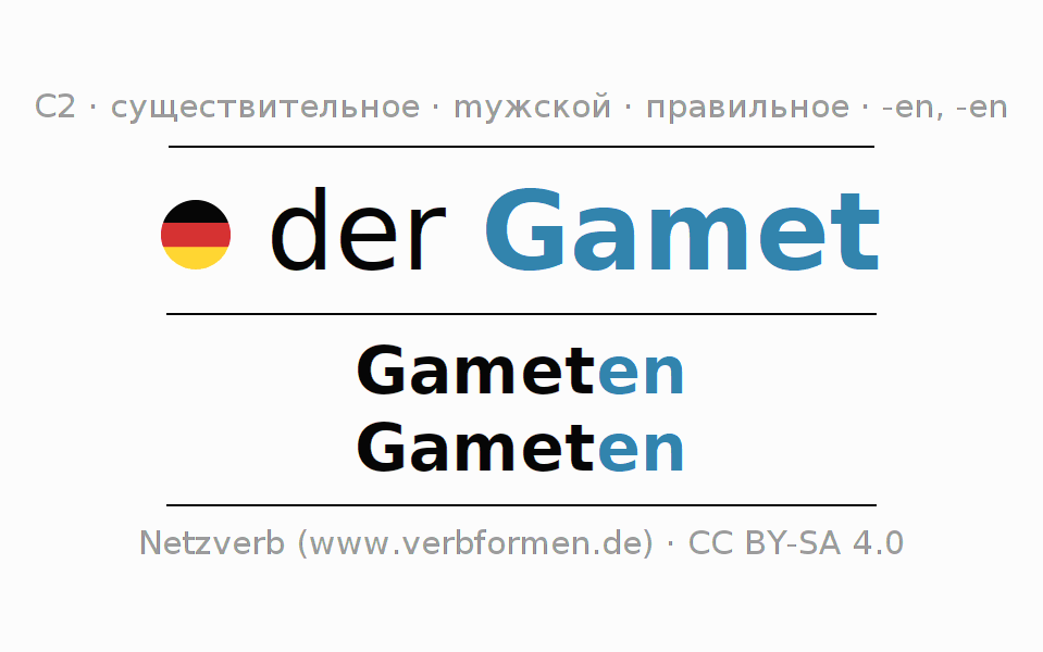 - Единственное число: der Gamet, des Gameten, dem Gameten, den Gameten