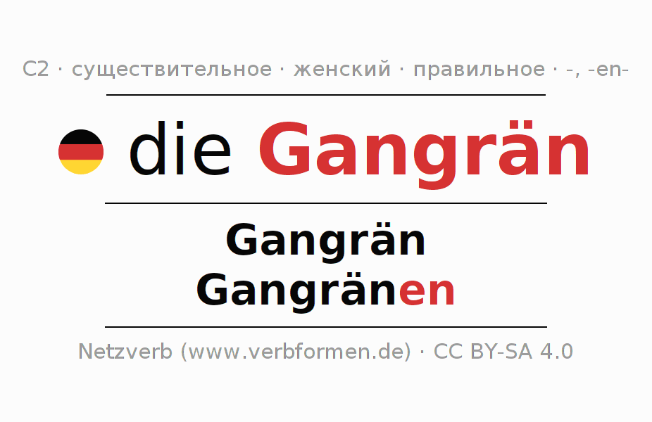 Склонение существительного Gangrän (гангрена) даётся в родительном падеже единственного числаGangrän и в именительном падеже множественного числа Gangränen. Существительное Gangrän склоняется по слабому типу, получая окончания -/en. Может употребляться и с другими окончаниями. Грамматический род Gangrän женский с определённым артиклем "die" Однако существительное может употребляться в другом роде и с другим артиклем. Здесь можно просклонять не только Gangrän, но и все немецкие существительные. Существительное включён в словарный запас обладателя сертификата знания немецкого языка уровня C2. Kомментарии ☆