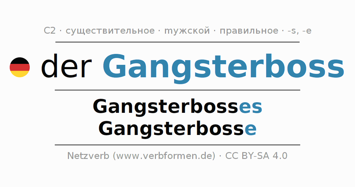 - Множественное число: die Gangsterbosse, der Gangsterbosse, den Gangsterbossen, die Gangsterbosse