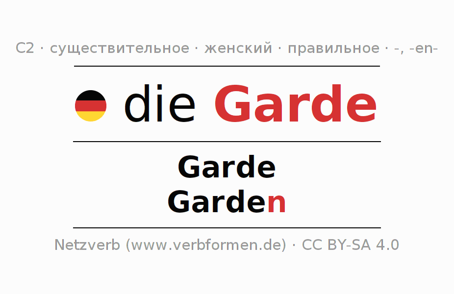 - Единственное число: die Garde, der Garde, der Garde, die Garde