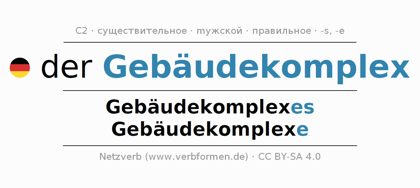 - Единственное число: der Gebäudekomplex, des Gebäudekomplexes, dem Gebäudekomplex(e), den Gebäudekomplex