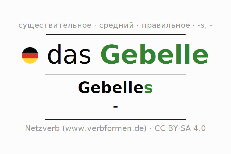 Склонение существительного Gebelle (лаянье) даётся в родительном падеже единственного числаGebelles и в именительном падеже множественного числа -. Существительное Gebelle склоняется по сильному типу, получая окончания s/-. Не образует форм множественного числа. Грамматический род Gebelle средний с определённым артиклем "das" Здесь можно просклонять не только Gebelle, но и все немецкие существительные. Kомментарии ☆