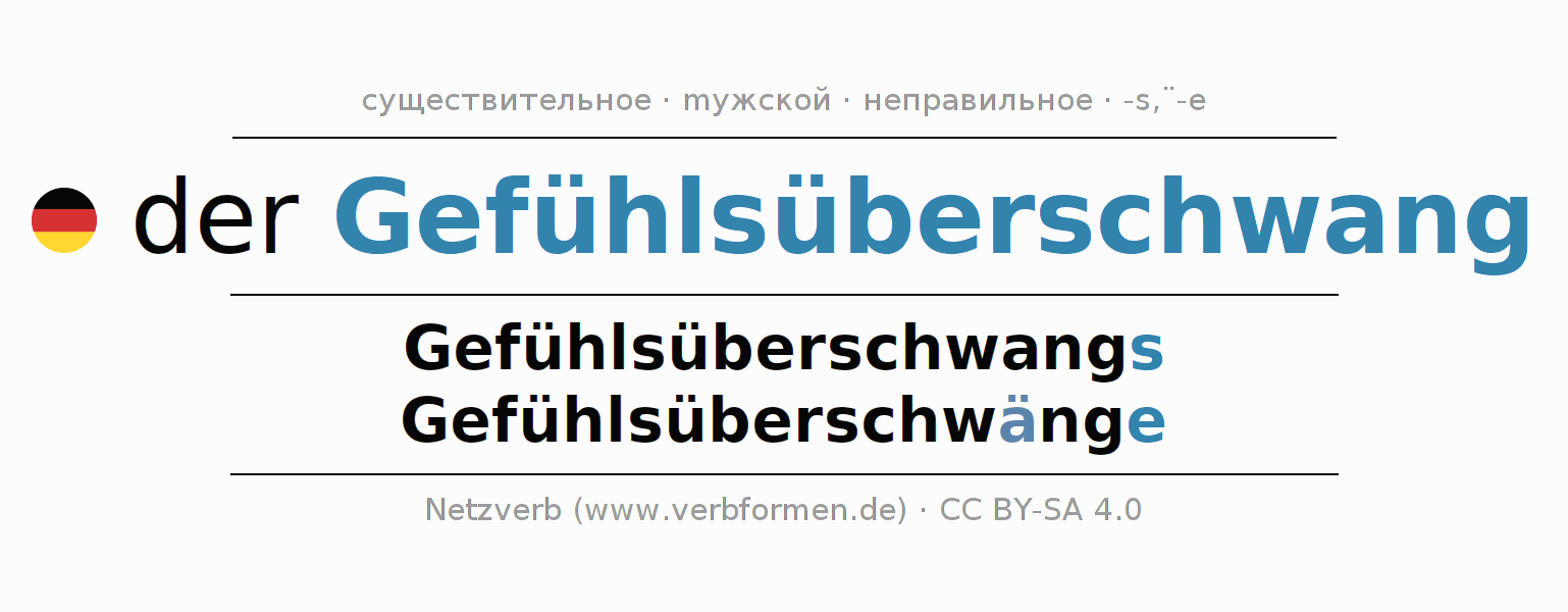 - Единственное число: der Gefühlsüberschwang, des Gefühlsüberschwangs, dem Gefühlsüberschwang, den Gefühlsüberschwang