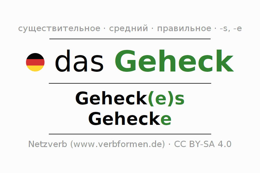 Склонение существительного Geheck даётся в родительном падеже единственного числаGeheck(e)s и в именительном падеже множественного числа Gehecke. Существительное Geheck склоняется по сильному типу, получая окончания es/e. Грамматический род Geheck средний с определённым артиклем "das" Здесь можно просклонять не только Geheck, но и все немецкие существительные. Kомментарии ☆
