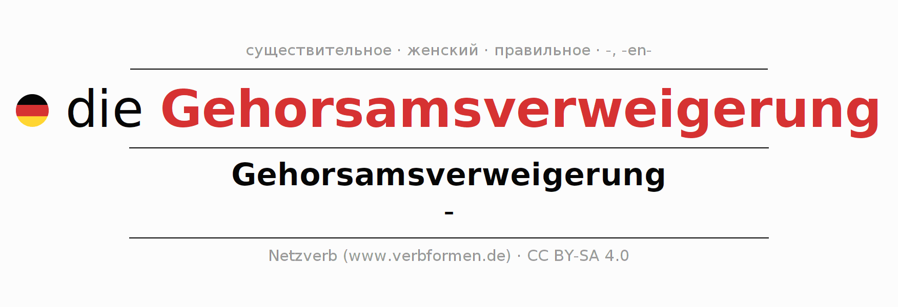 Склонение существительного Gehorsamsverweigerung (неповинове́ние, неподчинение) даётся в родительном падеже единственного числаGehorsamsverweigerung и в именительном падеже множественного числа -. Существительное Gehorsamsverweigerung склоняется по слабому типу, получая окончания -/-. Не образует форм множественного числа. Грамматический род Gehorsamsverweigerung женский с определённым артиклем "die" Здесь можно просклонять не только Gehorsamsverweigerung, но и все немецкие существительные. Kомментарии ☆