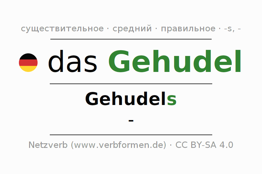 Склонение существительного Gehudel (неаккуратная работа, небрежность) даётся в родительном падеже единственного числаGehudels и в именительном падеже множественного числа -. Существительное Gehudel склоняется по сильному типу, получая окончания s/-. Не образует форм множественного числа. Грамматический род Gehudel средний с определённым артиклем "das" Здесь можно просклонять не только Gehudel, но и все немецкие существительные. Kомментарии ☆