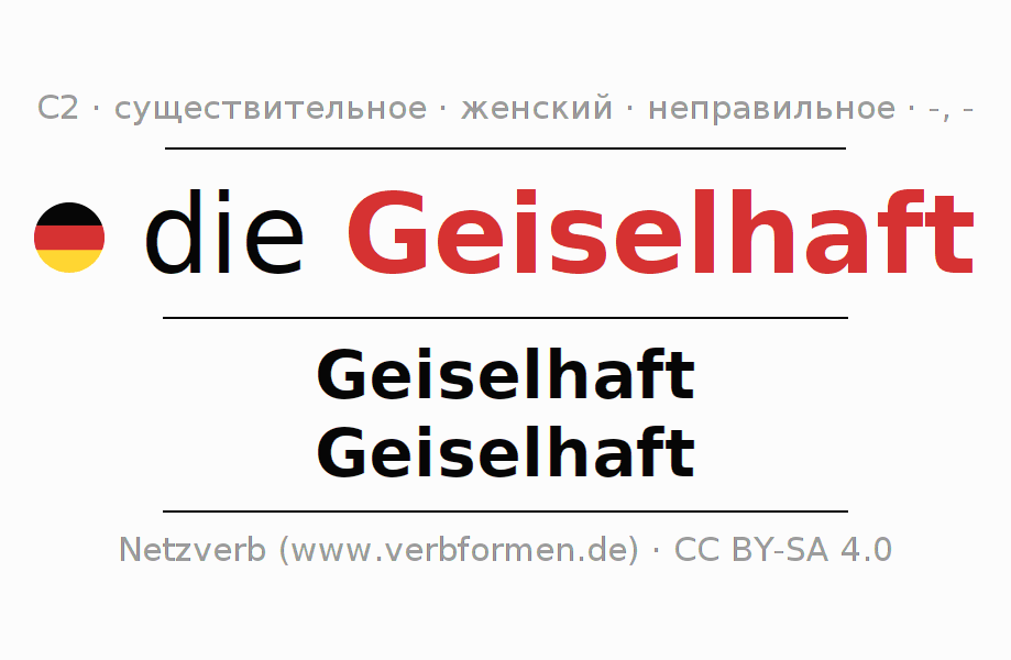 - Множественное число: die Geiselhaft, der Geiselhaft, den Geiselhaft, die Geiselhaft