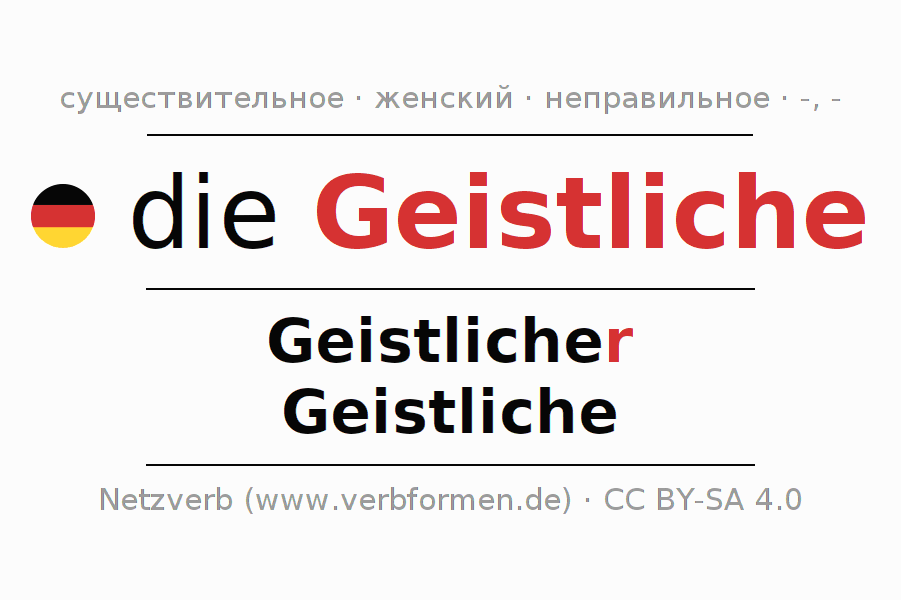 Склонение существительного Geistliche даётся в родительном падеже единственного числаGeistlicher и в именительном падеже множественного числа Geistliche. Существительное Geistliche при склонении получает окончания -/-. Грамматический род Geistliche женский с определённым артиклем "die" Однако существительное может употребляться в другом роде и с другим артиклем. Здесь можно просклонять не только Geistliche, но и все немецкие существительные. Kомментарии ☆
