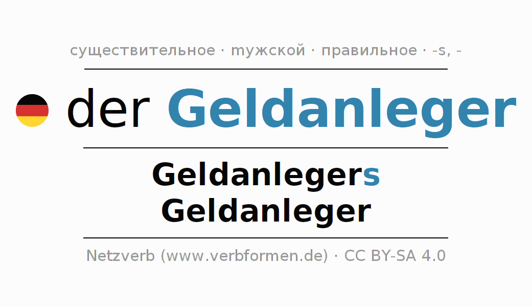 - Множественное число: die Geldanleger, der Geldanleger, den Geldanlegern, die Geldanleger