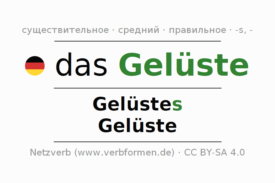 Склонение существительного Gelüste (влечение, желание) даётся в родительном падеже единственного числаGelüstes и в именительном падеже множественного числа Gelüste. Существительное Gelüste склоняется по сильному типу, получая окончания s/-. Грамматический род Gelüste средний с определённым артиклем "das" Здесь можно просклонять не только Gelüste, но и все немецкие существительные. Kомментарии ☆
