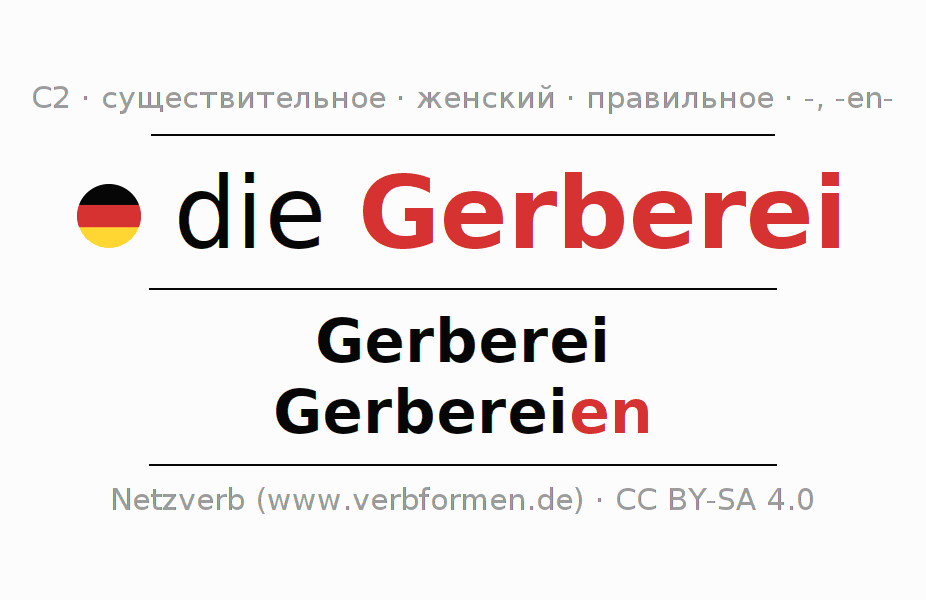 - Единственное число: die Gerberei, der Gerberei, der Gerberei, die Gerberei