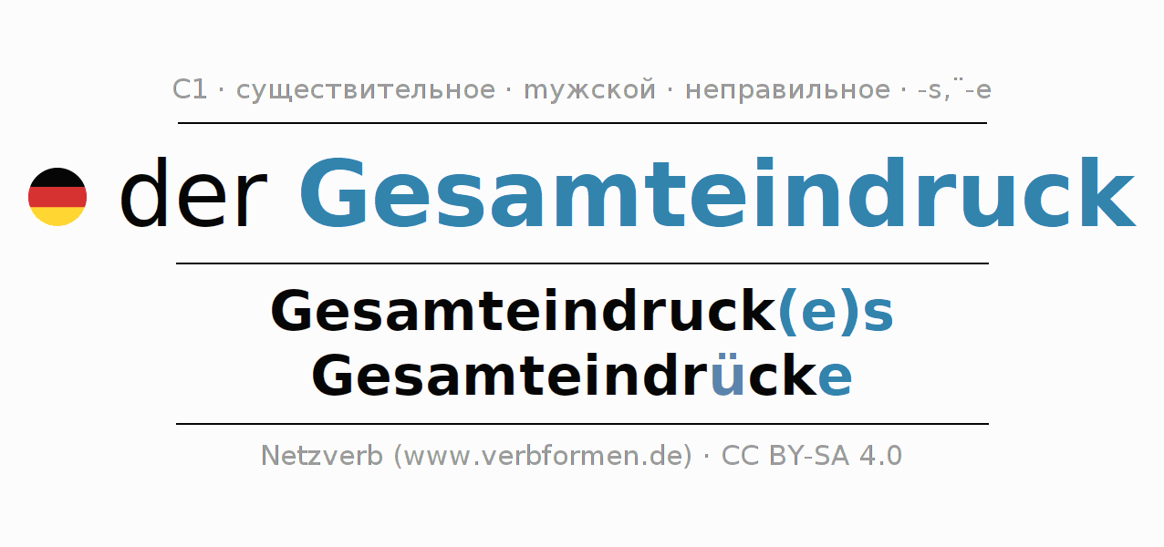 Склонение существительного Gesamteindruck (общее впечатление, о́бщее впечатле́ние) даётся в родительном падеже единственного числаGesamteindruck(e)s и в именительном падеже множественного числа Gesamteindrücke. Существительное Gesamteindruck склоняется по сильному типу, получая окончания es/ü-e. Во множественном числе стоит умлаут. Грамматический род Gesamteindruck мужской с определённым артиклем "der" Здесь можно просклонять не только Gesamteindruck, но и все немецкие существительные. Существительное включён в словарный запас обладателя сертификата знания немецкого языка уровня C1. Kомментарии ☆