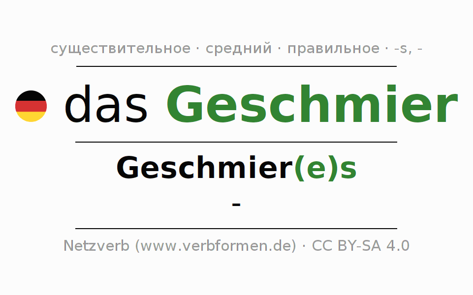 Склонение существительного Geschmier (мазня, мазня́) даётся в родительном падеже единственного числаGeschmier(e)s и в именительном падеже множественного числа -. Существительное Geschmier склоняется по сильному типу, получая окончания es/-. Не образует форм множественного числа. Грамматический род Geschmier средний с определённым артиклем "das" Здесь можно просклонять не только Geschmier, но и все немецкие существительные. Kомментарии ☆