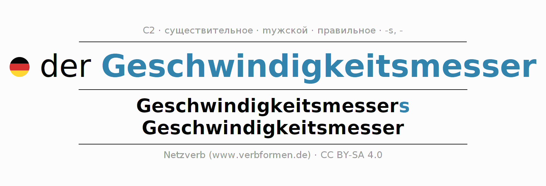 - Единственное число: der Geschwindigkeitsmesser, des Geschwindigkeitsmessers, dem Geschwindigkeitsmesser, den Geschwindigkeitsmesser