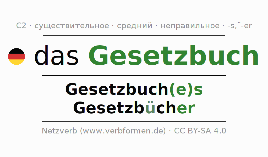 - Множественное число: die Gesetzbücher, der Gesetzbücher, den Gesetzbüchern, die Gesetzbücher