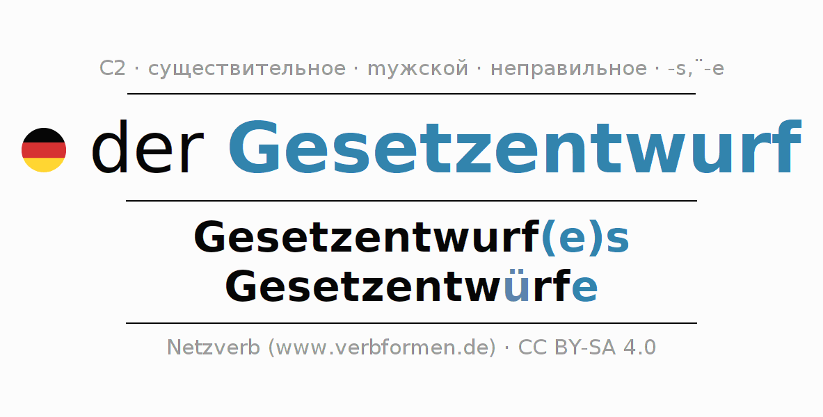 - Единственное число: der Gesetzentwurf, des Gesetzentwurf(e)s, dem Gesetzentwurf(e), den Gesetzentwurf