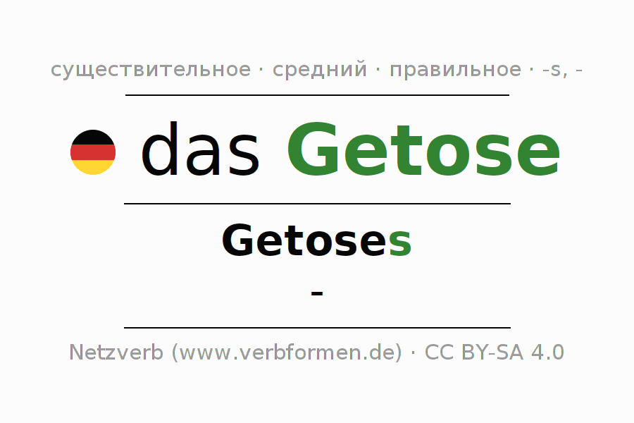 Склонение существительного Getose (грохот, шум) даётся в родительном падеже единственного числаGetoses и в именительном падеже множественного числа -. Существительное Getose склоняется по сильному типу, получая окончания s/-. Не образует форм множественного числа. Грамматический род Getose средний с определённым артиклем "das" Здесь можно просклонять не только Getose, но и все немецкие существительные. Kомментарии ☆