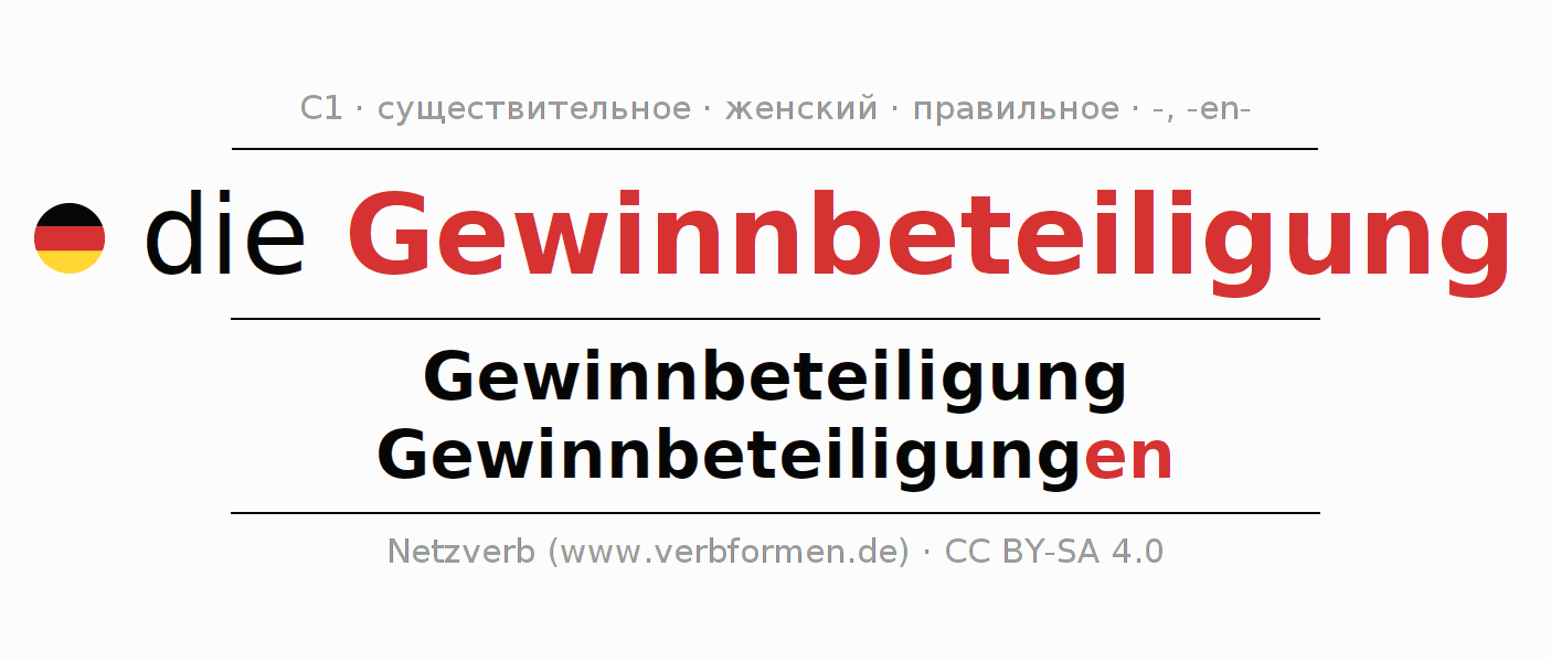 - Единственное число: die Gewinnbeteiligung, der Gewinnbeteiligung, der Gewinnbeteiligung, die Gewinnbeteiligung