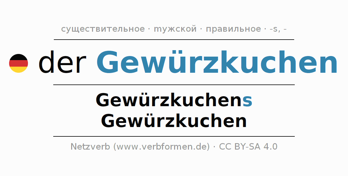 - Множественное число: die Gewürzkuchen, der Gewürzkuchen, den Gewürzkuchen, die Gewürzkuchen
