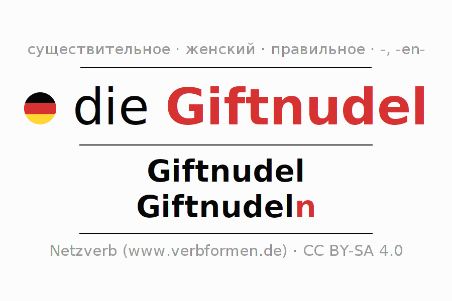 - Единственное число: die Giftnudel, der Giftnudel, der Giftnudel, die Giftnudel