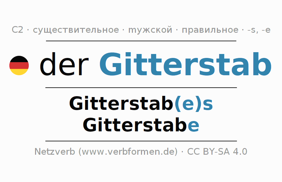 - Единственное число: der Gitterstab, des Gitterstab(e)s, dem Gitterstab(e), den Gitterstab