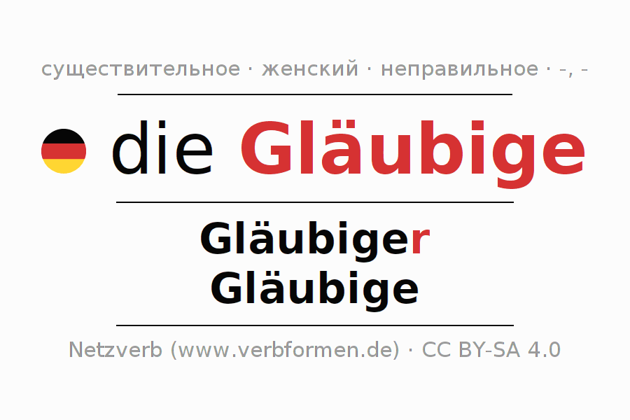 - Множественное число: die Gläubigen, der Gläubigen, den Gläubigen, die Gläubigen