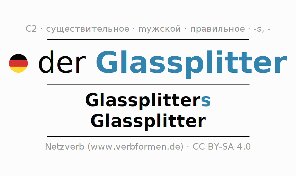 - Множественное число: die Glassplitter, der Glassplitter, den Glassplittern, die Glassplitter