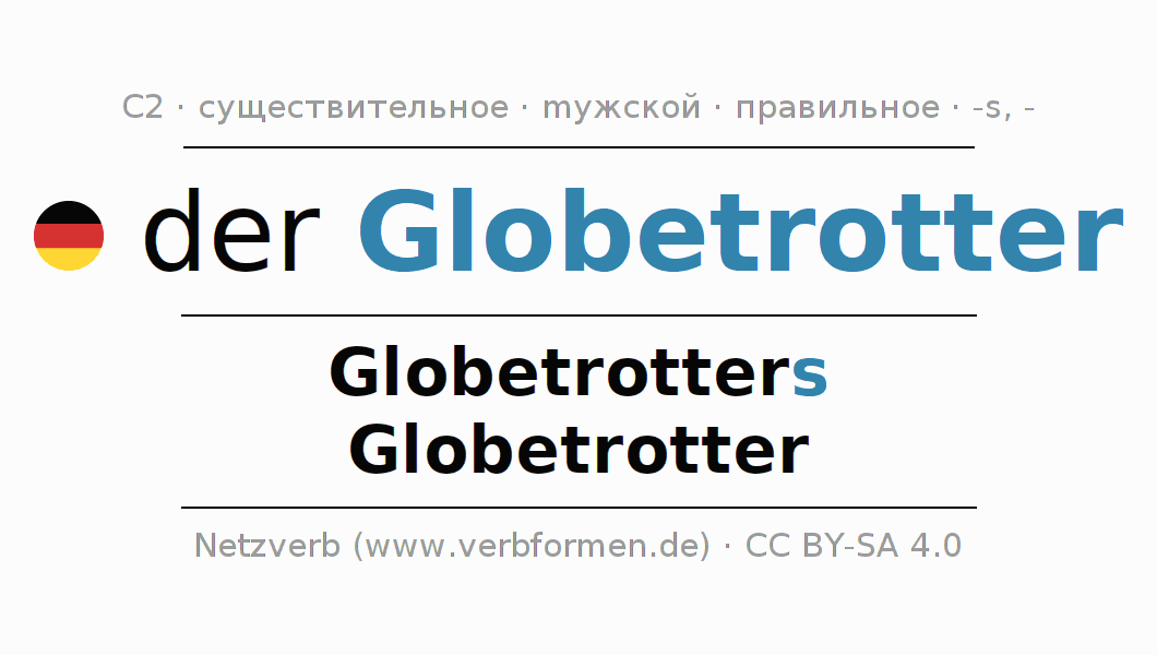 - Множественное число: die Globetrotter, der Globetrotter, den Globetrottern, die Globetrotter